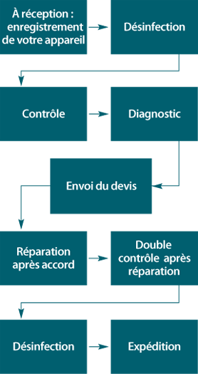 Dès que vous décelez une anomalie de fonctionnement ou dès que votre videoendoscope a subi un dommage, nous le prenons en charge et nous vous établissons un devis pour réparation.